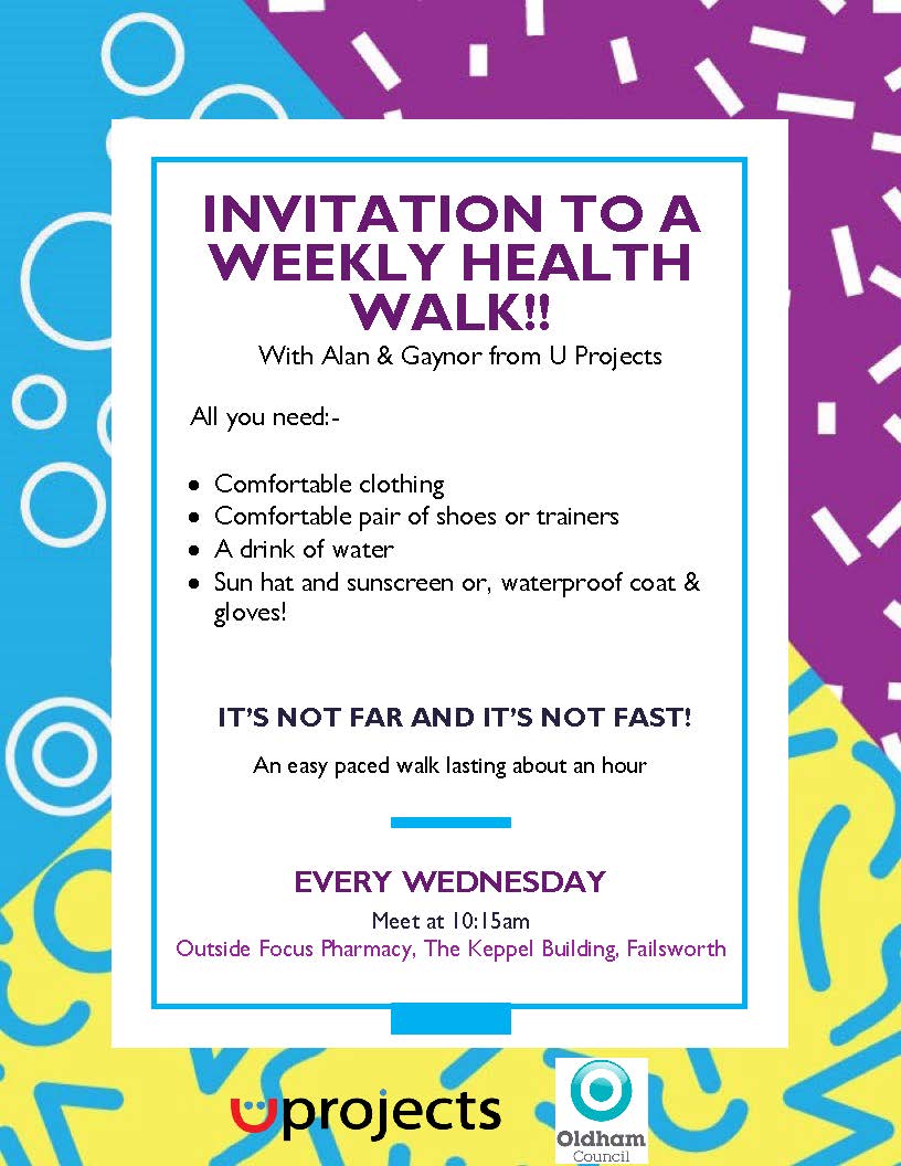The Failsworth walks are on Wednesdays at 10:15. See opposite and download the leaflet below, or contact Alan Keane: alan@uprojects.co.uk