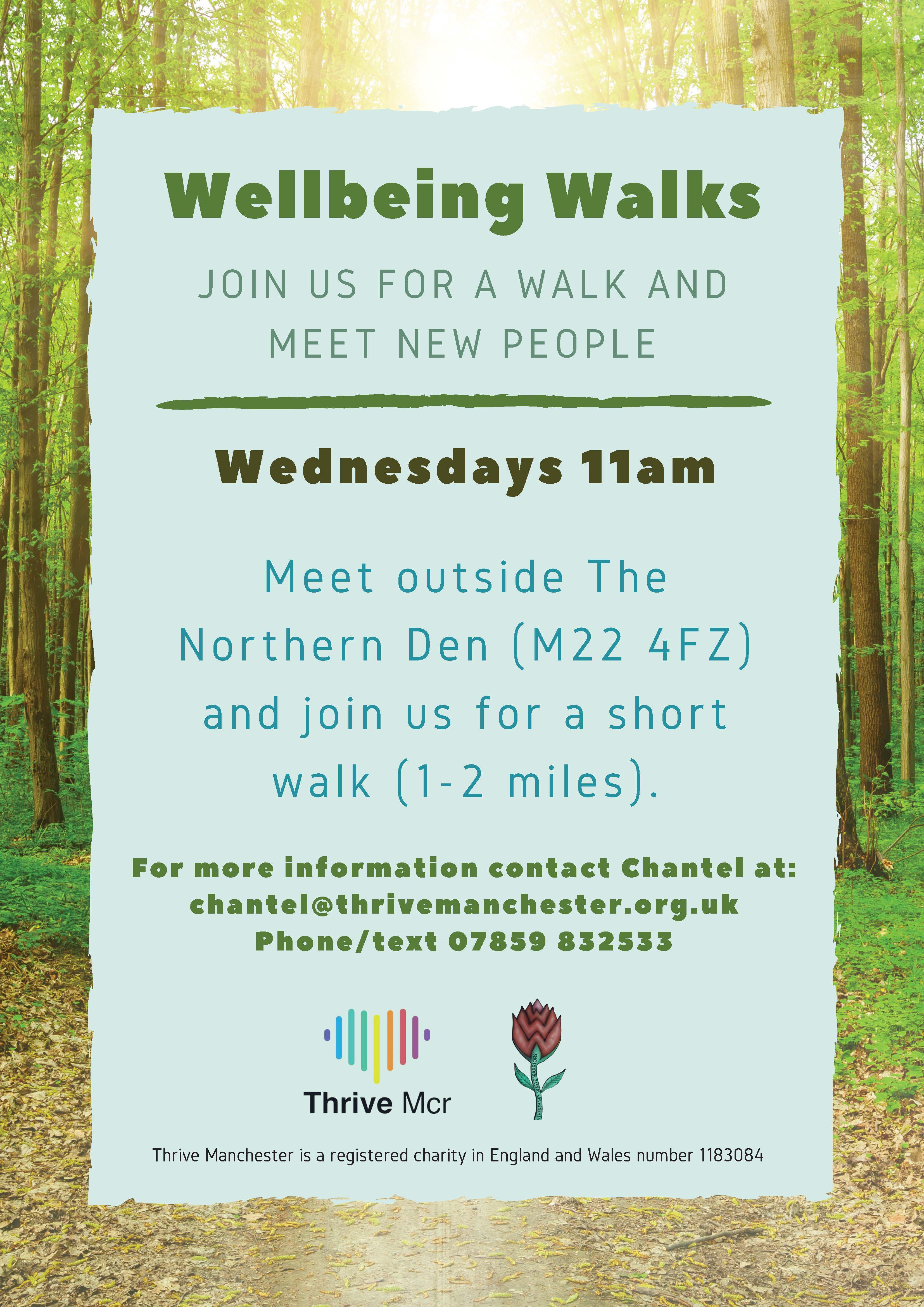 Thrive Manchester have a short Wellbeing Walk on Wednesdays at 11am outside the Northern Den in Wythenshawe.